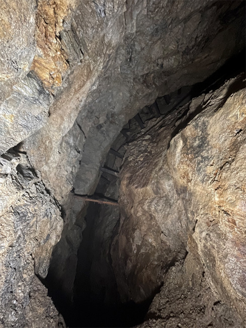 Die Etagenstrecke dagegen endet wieder blind. In der Ortsbrust sieht man wieder den hier nur noch Limonit führenden Gang, dem unsere Großväter nachgefahren sind, schräg nach links unten (Südwesten) einfallen.