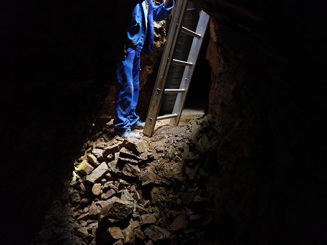 Wie kommt man hier ´ran ? Schließlich können wir weder Beton um die Ecke pumpen, noch Schotter als Füllbaustoff eimerweise durch die engen Gänge schleppen... Die Lösung lag eigentlich nah: Nach der Vermessung war klar, daß über der Firste des ‒ noch von der Stollnsohle ausgehenden und damit hier rund 50 m hohen ‒ Überhauens Ü.5 der Gangstrecke 58-1-1 gerade einmal noch 5 m Gestein und Erdreich anstanden. Eigentlich sowieso eine tickende Zeitbombe. Diese Schwebe brechen wir durch.