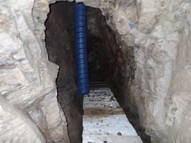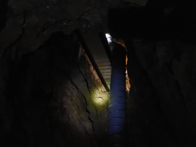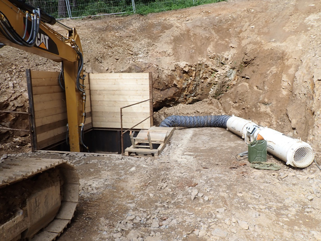 Okay - der Zugang zum Schurf 58-1-3 ist gesichert, der Lüfter bläst das Radon aus und wir können hinunter...