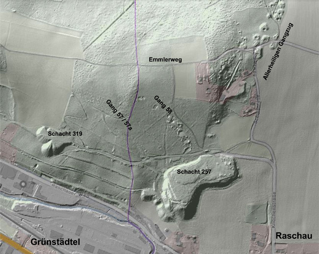 Die nördliche Abteilung des ehemaligen Erkundungsgebiets erstreckte sich bekanntlich über den Hang des Mittweidatals unterhalb des Knochens nordwestlich von Raschau. Der südliche Teil umfaßte Teile der Ortslage Grünstädtel. Von der Bundesstraße 101 aus fallen auf Höhe der Tankstelle am Ortseingang in Richtung Schwarzenberg noch immer die beiden Schachthalden südlich und nördlich am Talhang ins Auge. Die Stollen, Halden und Schürfe des Nordteils befanden sich innerhalb eines Waldgebietes, das sich in Privatbesitz befindet. Der nordwestlichste Teil gehört bereits zur Gemarkung Wildenau und befindet sich im Eigentum der Stadt Schwarzenberg. Die Haldenfläche des Schachts 257 befindet sich im Eigentum der Gemeinde Raschau- Markersbach und wurde ‒ wie schon erwähnt ‒ vor der Wende als Hausmülldeponie nachgenutzt. Das Gebiet befindet sich in nur geringer Entfernung von den bebauten Ortslagen Raschau und Grünstädtel und war aufgrund der nur in größeren Zeitabständen kontrollierten und nötigenfalls reparierten Einzäunung der Schadstellen für Anwohner, Spaziergänger und Wanderer im Wesentlichen ungehindert zugänglich. In der 1977 erstellten Bergschadenkundlichen Analyse dieses Gebietes (40073, Nr. 39) kann man lesen, daß die Bearbeiter damals zu dem Schluß gekommen sind, man könne den Bereich des Gangs 58 gar nicht weiter bearbeiten, weil „das Bruchgeschehen noch nicht abgeschlossen“ und eine nähere Inaugenscheinnahme der Pingen viel zu gefährlich sei. Kurz zusammengefaßt: Vielleicht nicht vordringlicher Sanierungsbedarf, aber kann man so nicht lassen.