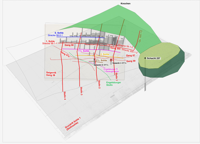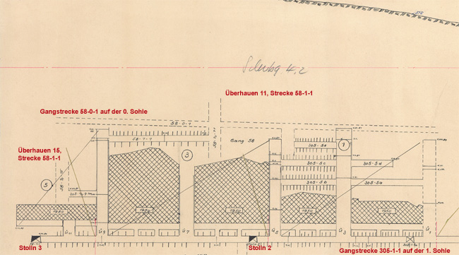 ![]() Sehen Sie noch durch ? Wir zeichnen es lieber wieder auf. Links die beiden zuletzt beschriebenen Tiefschürfe und Überhauen mit der Gangstrecke auf der Sohle 0 darunter. Die mittleren drei, von der Sohle 1 ausgehenden Überhauen haben die von übertage aus angesetzten Schürfe teils ziemlich weit verfehlt und auch die Etagenstrecken sind zum Teil völlig aus der Richtung gekommen... Vom Ü.2 ganz im Südosten (rechts) und auch vom Ü.5 in der Mitte aus sind noch weitere Etagenstrecken in tieferen Niveaus aufgefahren. Für die Sicherheit der Tagesoberfläche spielen die aber keine Rolle mehr. Auch die letzten Abbaugassen über den abgebauten Blöcken werden sich sukzessive durch hereinbrechende Massen selbst schließen.