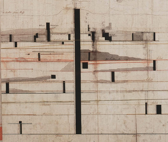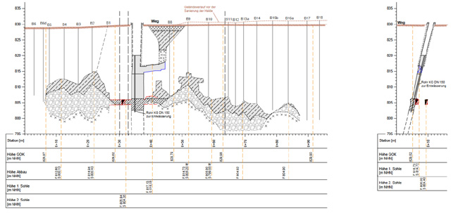 ![]() Abbildung 29: Saigerriss des Baubereichs, neben dem Schacht erkennt man den trichterförmigen Tagesbruch. Quelle: Projektteam Altstandorte.