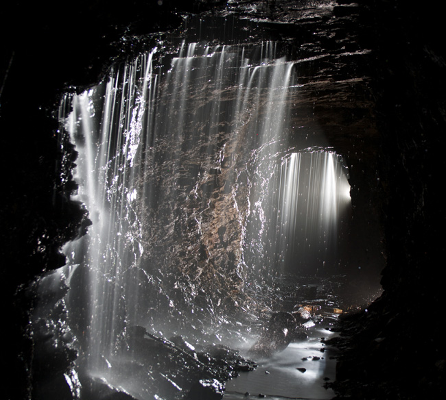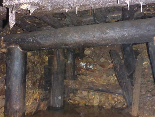 ![]() Abbildung 19: Starker Wasserzutritt im Querschlag 8-1 aus darüber befindlichen Abbauen während der Schneeschmelze, Foto: Falk Meyer.