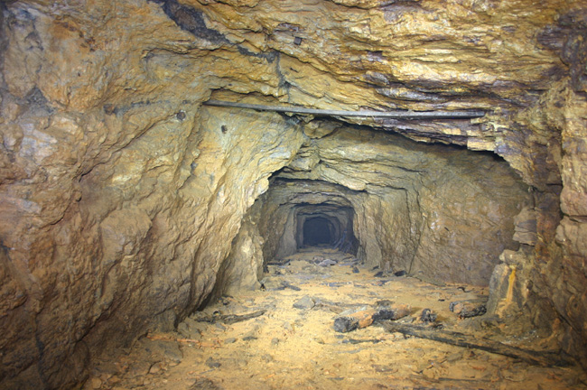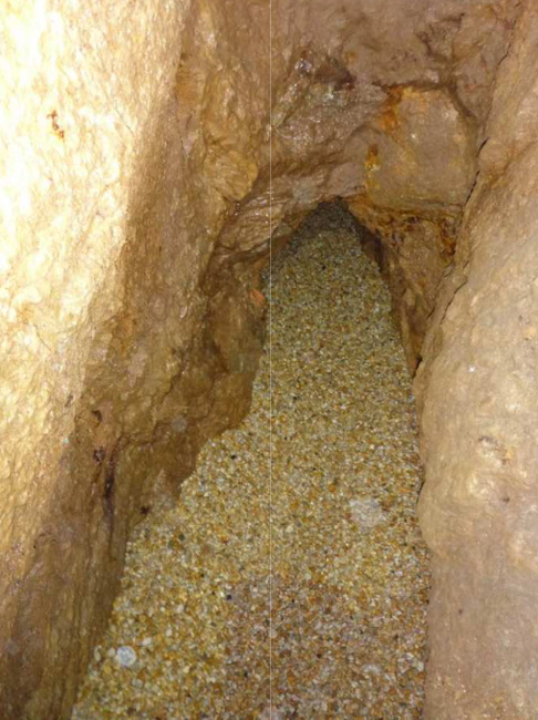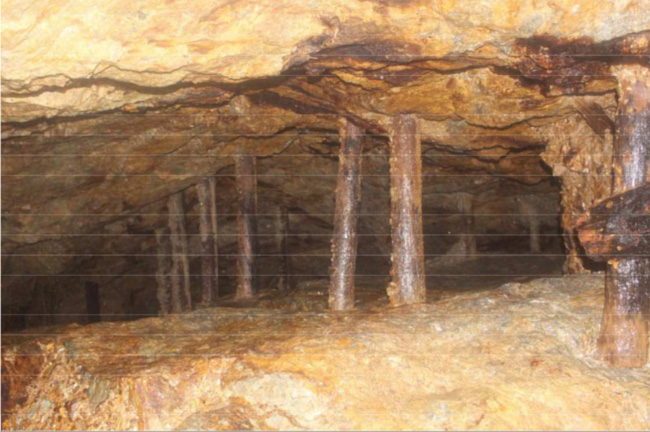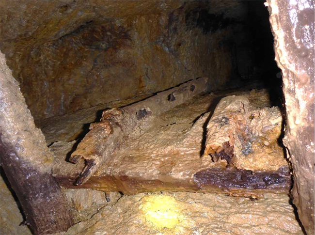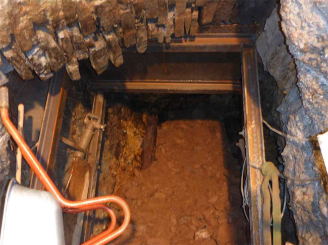 Das folgende Bild zeigt die leergezogenen bzw. nur teilversetzten Abbaublöcke in der Gangfläche, jeweils zu beiden Seiten von Schacht 42 existent. Der Ausbau stammt vom Uranerzbergbau.