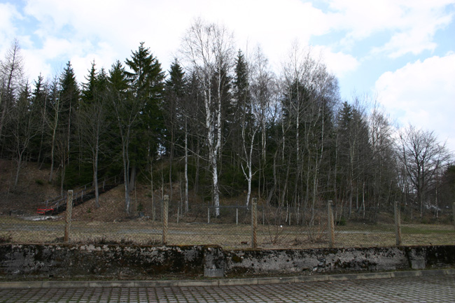 ![]() Abbildung 26: Mittig ganz links zwischen den Bäumen befindet sich der Schacht; Zustand unmittelbar vor der Sanierung der Halde; Foto: Torsten Koschel.