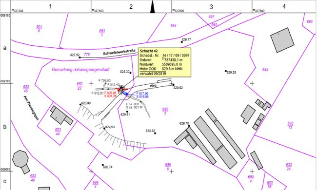 ![]() Abbildung 27: Flurstückkarte mit der Übertagesituation, Quelle: Projektteam Altstandorte.