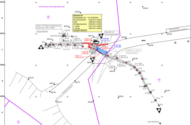 Auf Basis der Planungen durch das „Ingenieurbüro Eckert“ aus Chemnitz begann im Sommer 2018 die dritte und damit vielleicht auch letzte Verwahrung von Schacht 42. Dazu wurde der übertägige Betonkranz abgerissen, der Schachtkopf freigelegt und die 1988 eingebaute Plombe entfernt. Bei der Verwahrung wurden in einer Teufe zwischen 15 m bis 25 m Teufe Streckenabgänge gefunden, an denen sich tagesnah größere und teilweise leergezogene Abbaue anschlossen, die im Verlauf des Erzganges 2 m bis 3 m breite und offene Spalten bildeten. Wie schon im Text für das Jahr 1805 erwähnt, wurde der Schacht in dem Bereich des „Augustus Flachen“ geteuft, in dem der Gang auch das beste Erz brachte. Aus dieser Zeit könnten auch die vorgefundenen Abbaue stammen. Generell findet sich im unmittelbaren Bereich von Schacht 42 und auf dem „Augustus Flachen“ eine Vermischung aus den verschiedenen Bergbauperioden. Ob allerdings beim Uranerzbergbaus dort Abbau stattgefunden hat oder die Arbeiten nur Untersuchungscharakter hatten, ist aktuell nicht bekannt. Es lässt sich aber generell sagen, dass dieser Bereich arm an Uranerzen war. Die Situation der hier behandelten Mittelstadt lässt nicht mit der Situation unter der ehemaligen Altstadt von Johanngeorgenstadt vergleichen. Aber auch die harmlosere Uranerz- Erkundung birgt für die Tagesoberfläche gewisse Risiken. Auszuschließen ist auch nicht der Abzug von versetzten Bergemassen aus den Abbauen des Altbergbaus während des Uranerzbergbaus, was offene Abbauräume erzeugte und damit auf lange Sicht zum Problem für die Tagesoberfläche werden kann. In Johanngeorgenstadt, wie auch in Schneeberg, sollte man stark differenzieren, von welcher Bergbauära die Tagesbruchgefahr wirklich ausgeht. Hier und im weiteren Umfeld von Schacht 42 finden sich zahlreiche Auffahrungen aus dem Altbergbau, beispielhaft seien da nur die ehemaligen Berggebäude Silberkammer und Catharina genannt, welche zumeist auch sehr tagesnahe Auffahrungen aufweisen. Die nachfolgenden Einblicke zur Verwahrung machen die Arbeiten in und um den Schacht 42 verständlicher. Dazu wurden vom „Projektteam Altstandorte“ der Wismut GmbH*) einige Unterlagen bereitgestellt, die hier Verwendung finden. *) Anmerkung: Mit dieser Bezeichnung kürzen wir im weiteren Text die korrekterweise zutreffende, zugegebenermaßen aber auch recht „sperrige“ Bezeichnung „Projektträger des Freistaats Sachsen für die Sanierung der Wismut- Altstandorte“ (kurz: „PT Alt“) ab und meinen damit die Mitarbeiter der dafür zuständigen Abteilung innerhalb der Wismut GmbH, bei denen wir uns an dieser Stelle für die Bereitstellung des Materials noch einmal herzlich bedanken wollen. Die folgende Flurstückkarte zeigt die heutige Situation nach dem Teilabriss der Garagen. Ganz links unten findet sich zur Orientierung der Museumsgöpel, rechts oben als Quadrat erkennbar die Großpyramide.
