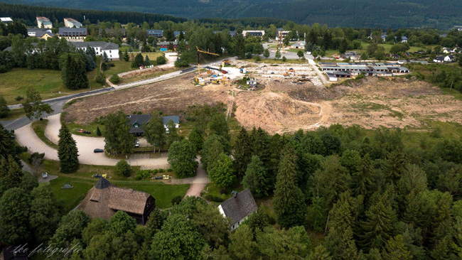 ![]() Abbildung 23: Luftbild der Baustelle; während diesem Zeitpunkt ist nur der Schacht in Bearbeitung, die Halde noch nicht gerodet, alle Garagen stehen noch, Foto: Torsten Koschel.