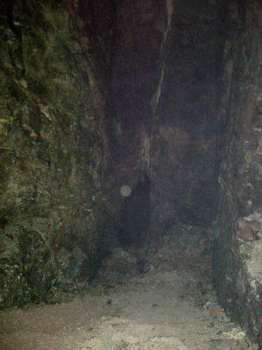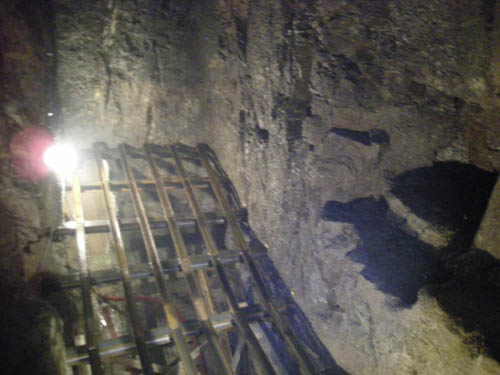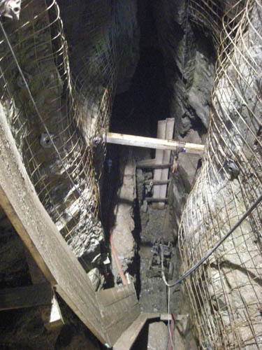 Der freigelegte Blindschacht liegt mit seiner langen Achse ebenfalls im Streichen des Ganges und ist sehr schmal. In der Kammer darüber müssen Haspel und Kunstkreuz einstmals ihren Platz gefunden haben. |