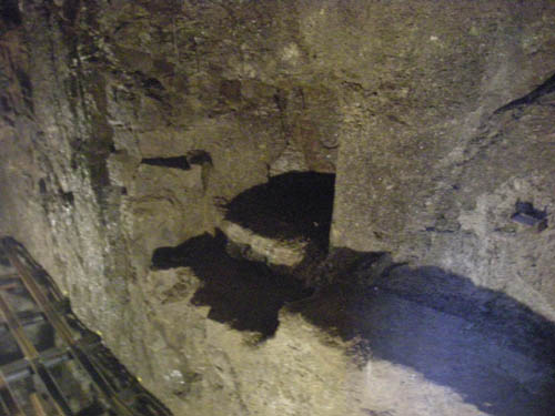 Ausgeschlägelter Einbruch von etwa 80 x 80 cm auf halber Höhe der Südseite der Kammer zur Aufnahme des südlichen Wellenlagers. |