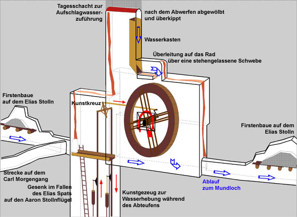 Die meisten Radstuben haben die Vorfahren recht aufwendig im standfesten Nebengestein der Erzgänge ausgehauen, weil die Wasserhaltung im Grubengebäude natürlich von elementarer Bedeutung für einen sicheren Bergbaubetrieb war. Diese Radkammer im Johanngeorgenstädter Revier dagegen war vermutlich ein reiner "Zweckbau", der von vornherein eine geringere Betriebsdauer haben sollte, denn nach dem Durchschlag des Gesenkes auf den darunter verlaufenden Flügel des Aaron Stollns war eine Wasserhaltung in diesem Schacht nicht mehr erforderlich. Deshalb wurde sie in der Zeit zwischen 1729 und 1741 mit möglichst geringem Aufwand direkt im Streichen des Elias Spats - einer aus Gesteinsbrekzien, Quarz, etwas Spat und Letten bestehenden und höchst gebrächen Trümerzone - angelegt, welcher der Elias Stolln bis ins Abbaufeld unter dem Fastenberg folgt. Das weichere Gestein erlaubte so einen besonders schnellen Ausbruch der zirka 12 m hohen (bis zur Schwebe) und 11 m langen Kammer. Ob anschließend tatsächlich ein Kunstrad eingebaut wurde und wie lange es in Betrieb stand, geht aus den bisher recherchierten, späteren Unterlagen nicht eindeutig hervor. Aufgrund der Existenz der Radkammer wurde der dahinterliegende Blindschacht aber danach immer als "Kunstschacht" bezeichnet, obwohl der Tagesschacht später mit einem Gewölbe verschlossen und mit Haldenmassen überkippt wurde. Auf jüngeren Rißunterlagen ist der Tagesschacht gar nicht mehr dargestellt. So ist die Anlageweise dieser Radkammer zumindest recht ungewöhnlich, wenn auch nicht ganz einzigartig in Sachsen. Das Kunstrad muß in Richtung Mundloch neben dem Schacht mit der Welle quer zur langen Schachtachse gestanden haben. Über der Radkammer hat man eine kleine Schwebe stehengelassen, die vermutlich der Überleitung des Aufschlagwassers aus dem Schacht auf das Rad gedient hat. Während der Aufwältigung brach sie herunter - höchste Zeit also für eine dauerhafte Sicherung. Im Südstoß der Kammer war auf halber Höhe ein pyramidenstumpfförmiger, zirka 80 x 80 cm großer und 60 cm tiefer Einbruch ausgeschlägelt, der vermutlich das südliche Wellenlager aufgenommen hat. Aufgrund der asymmetrischen Lage der Kammer zum Blindschacht müssen die Kunstgestänge auf deren Nordseite eingebaut gewesen sein. Dort ist kein gleichartiges Lager vorhanden. Der Blindschacht selbst
