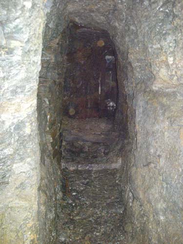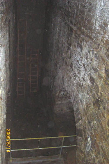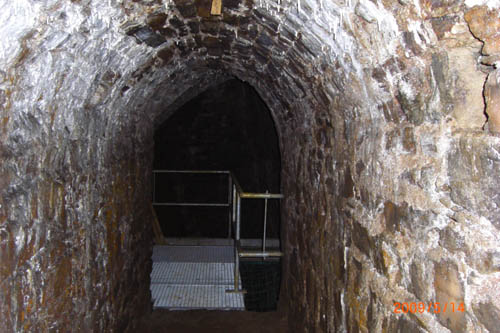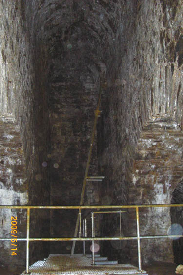 An deren Ende blickt man in die Radkammer hinein. Hier befand sich das Kunstrad. Rechts vom Geländer eines der beiden Gewölbe über den Wellenlagern. |