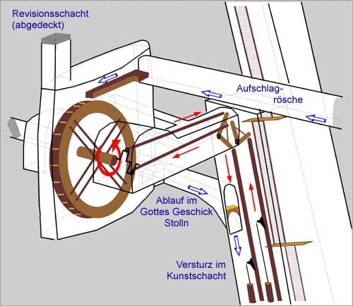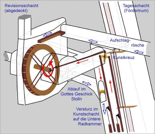 Auf ihrer Sohle ist die Radkammer über einen Durchschlag mit dem Gottes Geschicker Stolln verbunden. |