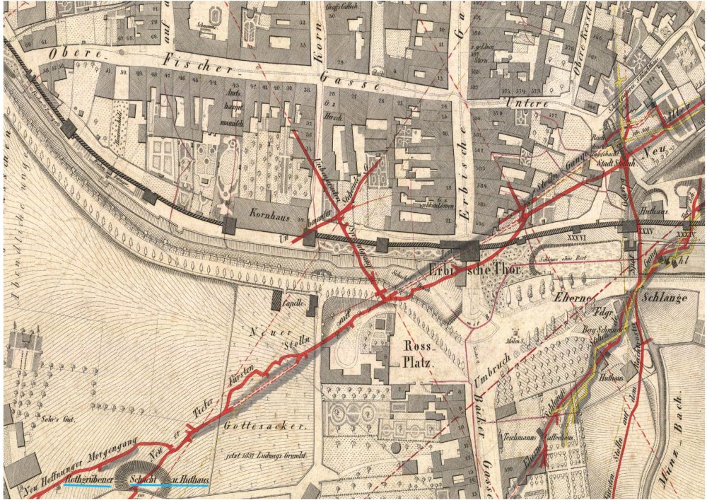 ![]() Um 1837, dem Entstehungsjahr dieses Freiberger Stadtplanes von Heinrich Adolph Schippan, lag der „Rothgrübner Schacht“ (blau unterstrichen, am linken unteren Bildrand) noch außerhalb der Stadt, etwas entfernt vom Erbischen Tor und nahe eines nicht mehr genutzten Friedhofes (Gottesacker). |