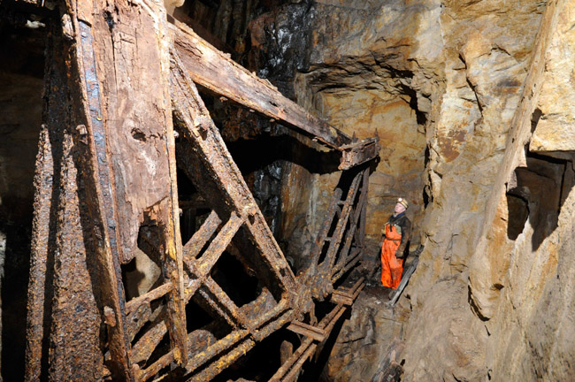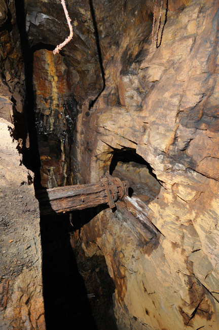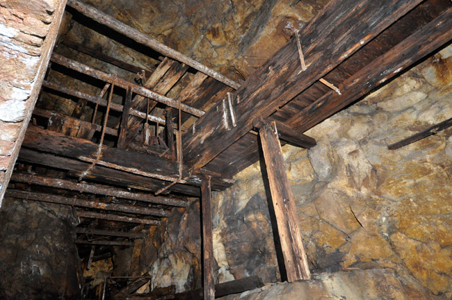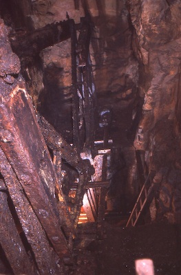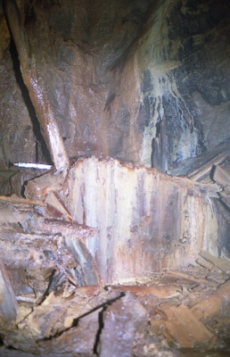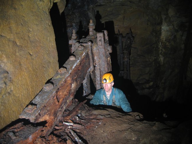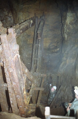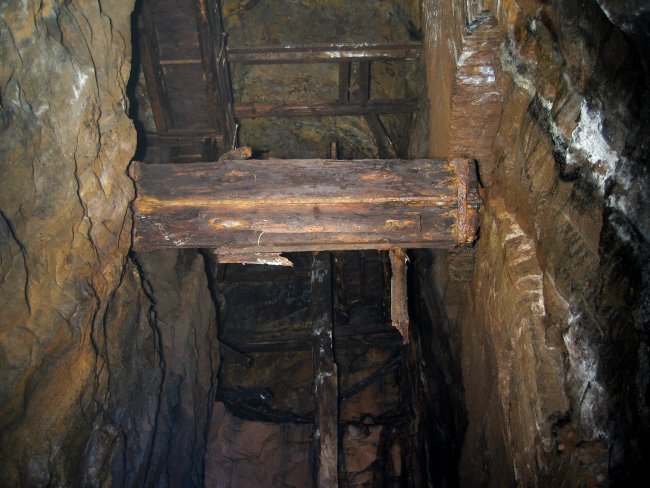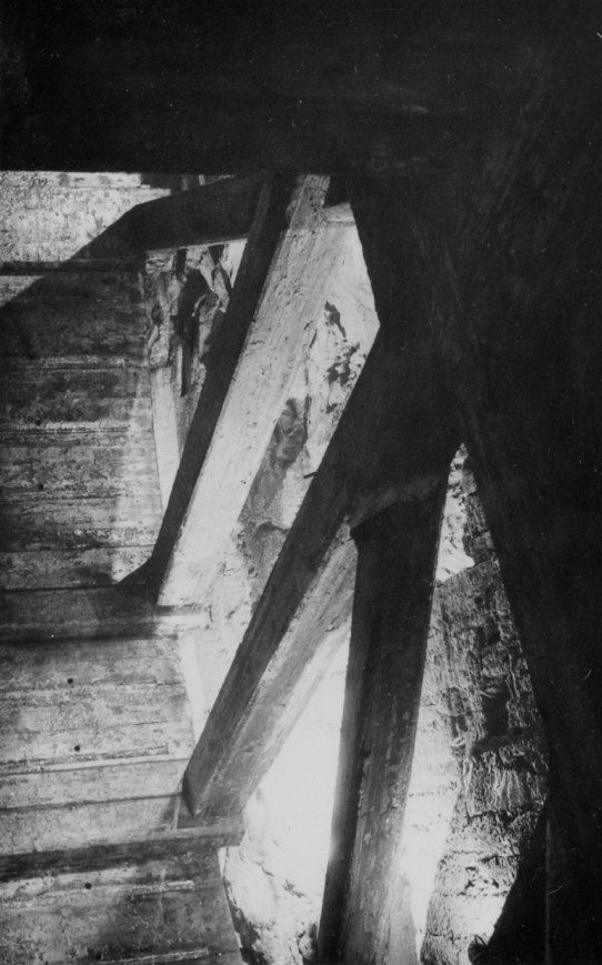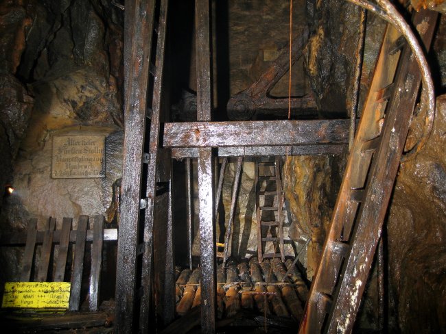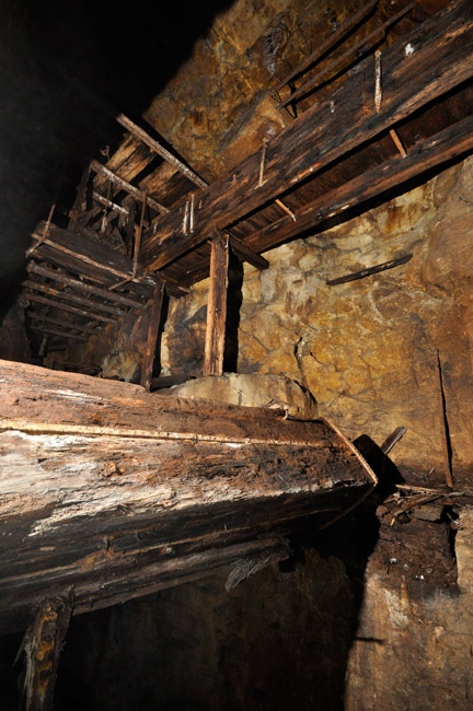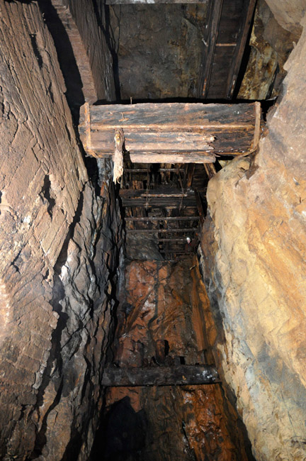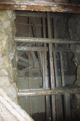 ![]() Auch 2013 sind solche Bilder noch möglich! Der Rundholzbelag über dem offenen Schacht ist noch tragfähig (Foto: S. Weigoldt) |