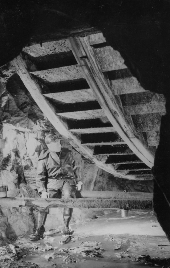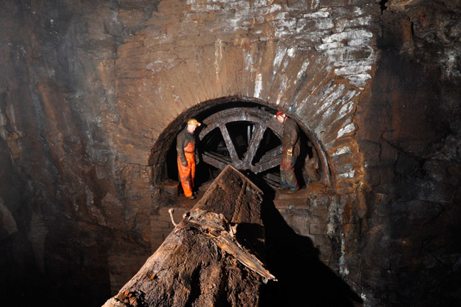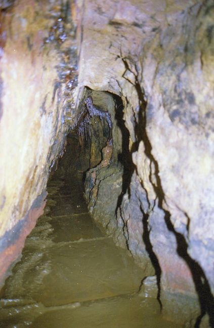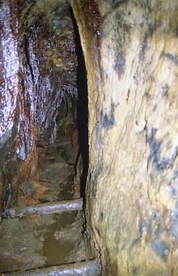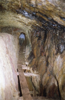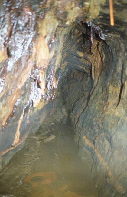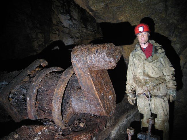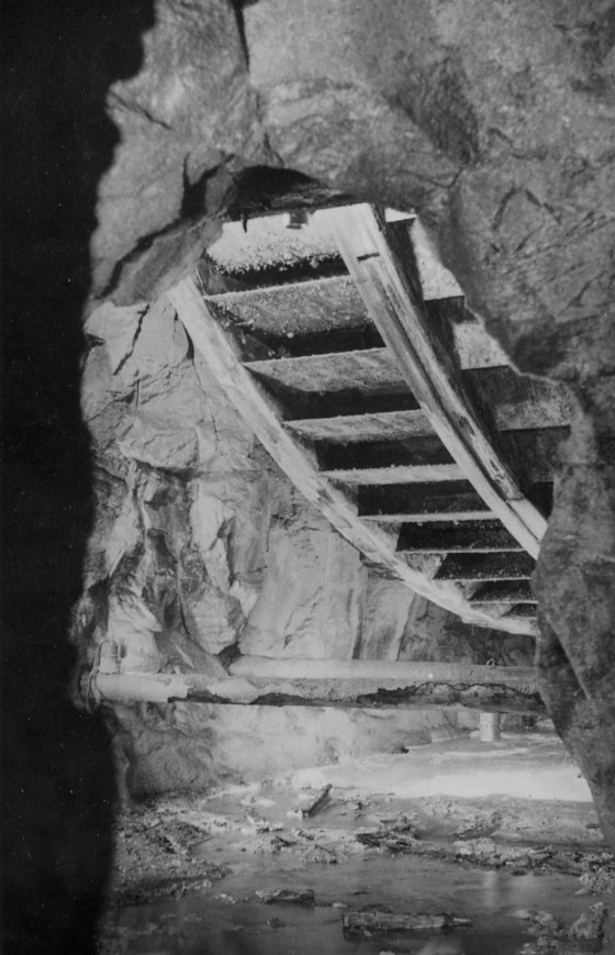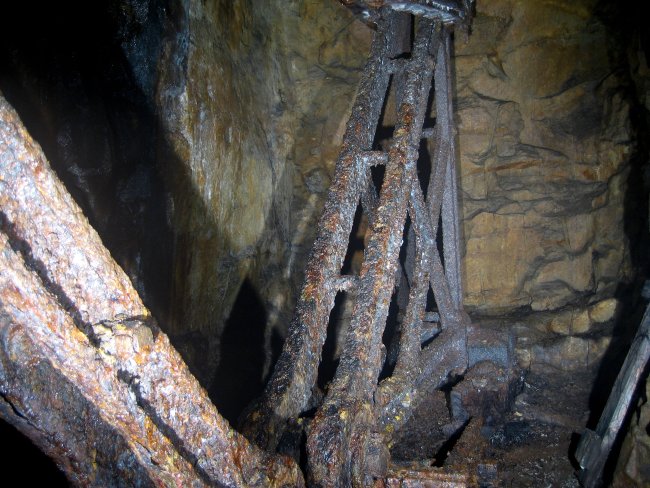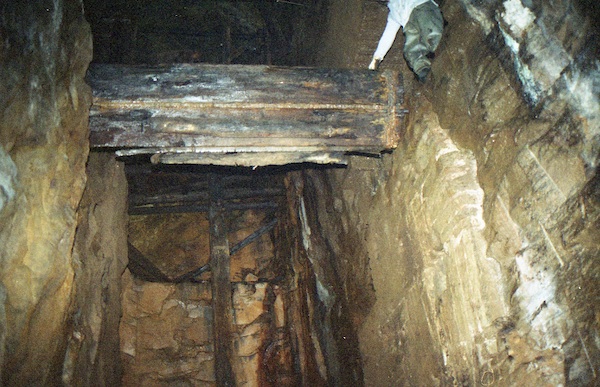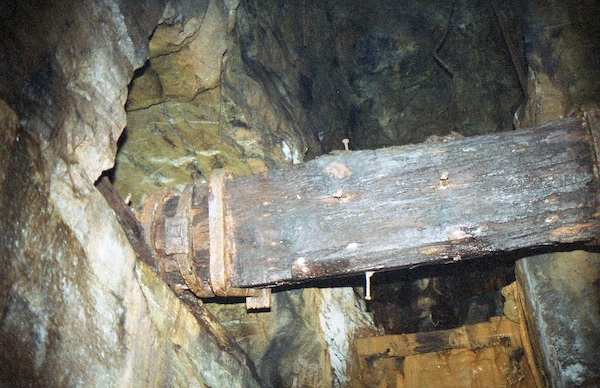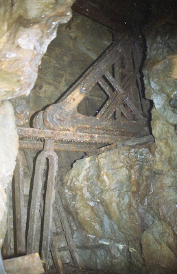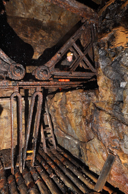 ![]() Auch 2013 sind solche Bilder noch möglich! Der Rundholzbelag über dem offenen Schacht ist noch tragfähig (Foto: S. Weigoldt) |