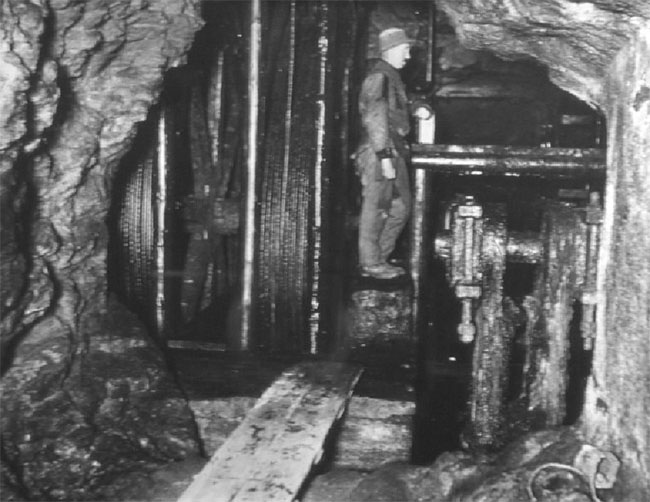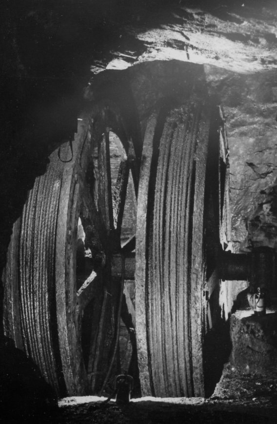 ![]() Ansicht der Seilkörbe aus dem Schacht heraus um 1954 (Foto: Wagenbreth / Zimmermann, Sammlung Voigt, Freiberg). |