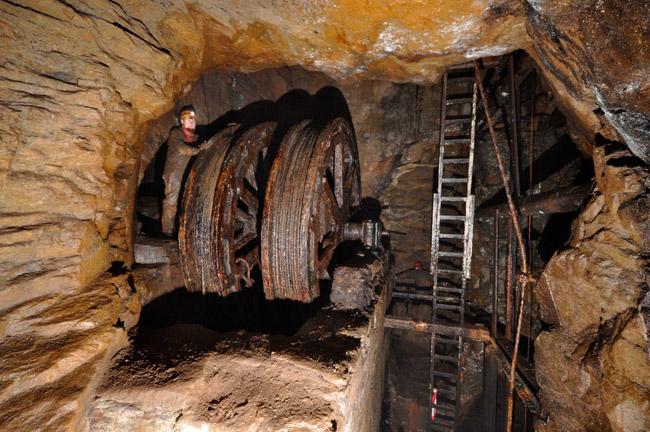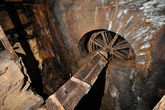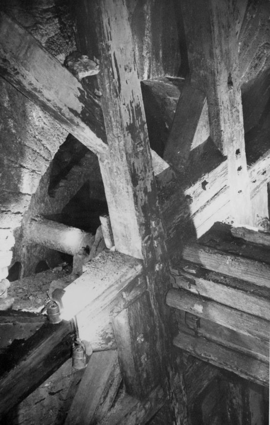 ![]() Blick durch das Kehrrad in Richtung der Seilkörbe (Foto: Wagenbreth / Zimmermann, Sammlung Voigt, Freiberg). |