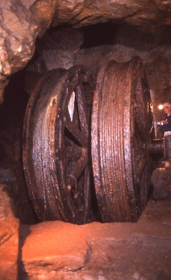 ![]() Die Führungsrollen der ebenfalls nicht mehr vorhandenen Kunstgestänge (Foto: Wagenbreth / Zimmermann, Sammlung Voigt, Freiberg). |