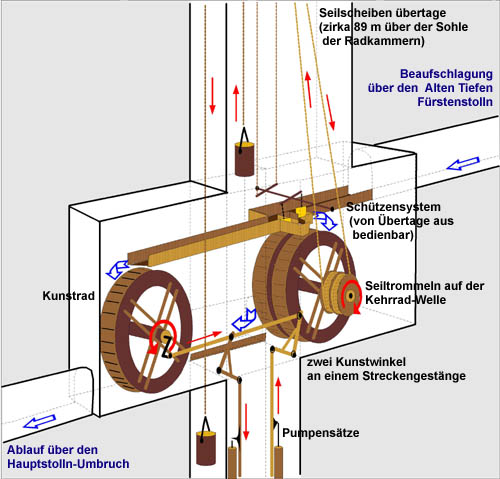 Das Kunstgezeug der Roten Grube Schon 1851 begannen die Vorbereitungen zum Einbau einer Kunstradanlage zur Wasserhebung für den im Bau befindlichen „Rothschönberger Stolln“. Dafür wurde der „Rothgruber Richtschacht“ zunächst um 3,6 Lachter bis unter den “Alten tiefen Fürstenstolln“ weiter verteuft. Auf dieser Sohle wurde eine Rösche zur Beaufschlagung des geplanten Kunstrades sowie für das Kehrrad zur Förderung herangeführt und mit dem Richtschacht durchschlägig gemacht.