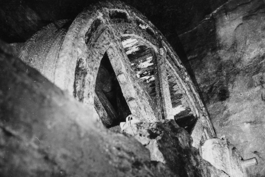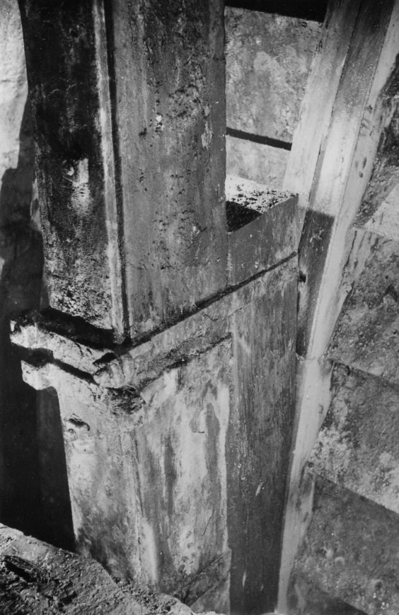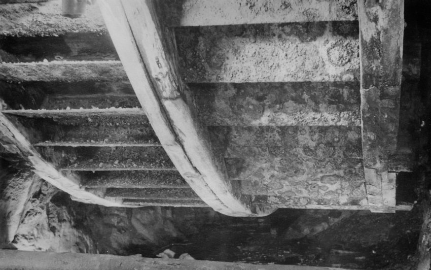 ![]() Die Wasserzuführung für das Kehrrad im Bereich der Aufschlagrösche mit Rest der Reguliereinheit (Foto: Wagenbreth / Zimmermann, Sammlung Voigt, Freiberg). |