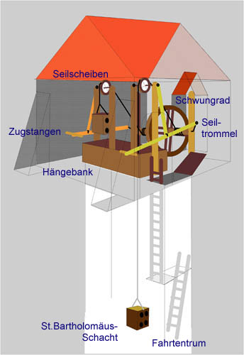 Ein Beispiel einer gleichermaßen simplen, wie effizienten Lösung mit einfachsten mechanischen Mitteln kann man am erstmals im Jahr 1529 in den Bergwerksakten erwähnten St.Bartholomäus- Schacht in Brand-Erbisdorf bestaunen. Man muß dazu vorneweg