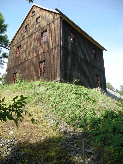 Fast waren es schon "Typenbauten" - wenigstens übertage versuchte man mit vereinheitlichten Bauten Geld zu sparen: Das Treibehaus des siebenten Lichtlochs war eine fast exakte Kopie des einst am vierten Lichtloch errichteten. Der Bau des Rothschönberger Stollens von 1844 bis 1877 nämlich war auch so schon teuer genug und wäre ohne staatliche Beihilfe nie angegangen worden. Für diejenigen, die sich um den Erhalt der Baudenkmale an den anderen sieben Lichtlöchern bemühen, ist es jedenfalls ein Glücksfall, daß auf halber Länge des fiskalischen Teils des Stollens, im idyllischen Reinsberg östlich von Siebenlehn, dieses Stück Bergbaugeschichte so komplett stehen geblieben ist. Hier kann man sich anschauen, wie die Bauten ausgesehen haben, die an anderer Stelle die Zeiten gar nicht überdauert haben oder heute mühsam erhalten und wiederaufgebaut werden. Daß dem so ist, ist auch dem Umstand zu danken, daß der Rothschönberger Stollen für den Freiberger Bergbau, der erst 1970 endgültig (??) eingestellt wurde, eine immense Bedeutung hatte und deshalb - außer den Zugängen über das Stollntor und die Flügel im Grubenfeld - wenigstens ein weiterer Zugang unterhalten werden mußte. Der fiskalische Teil des Stollens vom Verstufungspunkt südlich von Halsbrücke bis Rothschönberg ist insgesamt 13.900 Meter lang - etwas zuviel ganz ohne "Luftloch". Obwohl übertage "typisiert", erforderte doch jedes Lichtloch aufgrund der unterschiedlichen topographischen Lage und der jeweiligen Geländemorphologie auch eigenständige technische Lösungen für das Abteufen, die Wasserhaltung und die Förderung des Abraums. Dabei kamen bereits Dampfmaschinen zum Einsatz (am sechsten Lichtloch, wo man partout kein Aufschlagwasser heranführen konnte). Wo es ging, griff man dagegen auf bewährte Technik zurück: Unterhalb der Wünschmannmühle in Krummenhennersdorf wurde ein Kunstgraben (heute als "die Grabentour" bekannt) aus der Bobritzsch abgezweigt und zunächst zum fünften Lichtloch und dann noch weiter bis zum vierten Lichtloch in Reinsberg geführt. Den letzten Abschnitt vom (weitgehend) übertägig angelegten Kunstgraben bis zum vierten Lichtloch mußte man dazu aber mit der allein schon rund 900 m langen "Reinsberger Rösche" überbrücken. Beide Schächte konnten aber dann komplett mit Wasserkraft betrieben werden. Am vierten Lichtloch steht heute noch das komplette Gebäudeensemble eines Schachtes aus der Mitte des 19. Jahrhunderts: Neben dem Huthaus - in dem sich zu dieser Zeit bereits nur noch die Verwaltung und technische Leitung befand - auch die wichtigsten Nebeneinrichtungen für die Hilfsgewerke: Zimmermannswerkstatt und Schmiede. Und natürlich das Treibehaus über dem Schacht mit den Förderanlagen. Vom einstigen Pulverturm sind auf der anderen Straßenseite im Wäldchen versteckt zumindest noch die massiven Fundamente erhalten. Ein ganzer Pulverturm steht noch am VII. Lichtloch in Halsbrücke. Dem Förderverein ist es zu danken, daß inzwischen nicht nur Leben wieder einzieht und Sammlungen mit seltenen Ausstellungsstücken die Schauanlage vervollständigen. Das Huthaus wird restauriert, die beiden Radkammern wurden bereits freigelegt und heute kann man nicht nur von oben hineinschauen, sondern auch über den Hilfsstollen unter der Halde in die Radkammern hinein und über die Abzugsrösche wieder ausfahren. Da ist es zweitrangig, daß die Fahrung im Schacht zwar im Originalzustand erhalten geblieben - leider aber eben nicht mehr fahrbar ist. Statt 84 m bis auf die Stollnsohle hinunter - und dann auch wieder hinauf - zu steigen, ist die Besichtigung der zwei Radkammern und die Befahrung der rund 185 m langen Rösche ein erheblich weniger anstrengendes Abenteuer... Schauen Sie auch einmal vorbei - es lohnt sich ! Der Verein öffnet u. a. am "Tag der Schauanlagen" jeweils am ersten Sonntag im Juli (in der DDR einst der "Tag des Bergmanns") oder am "Tag des offenen Denkmals" am zweiten Sonntag im September.