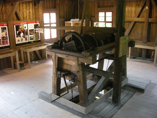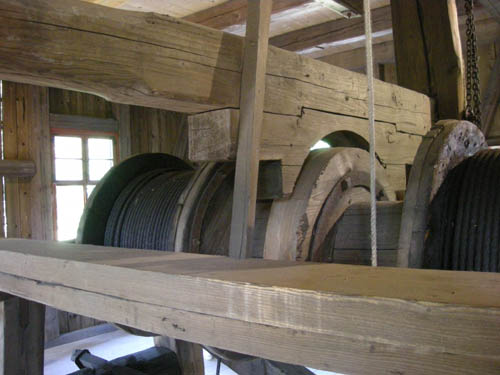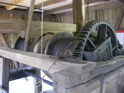 Auch noch original: In der ersten Etage über dem Schachtkopf steht für die "Förderkörbchen" eine immerhin viermännige Handhaspel. |