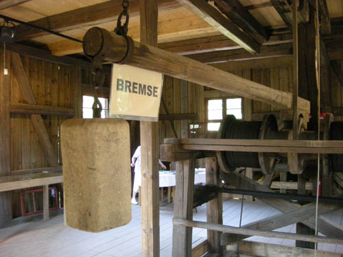 Beim Bartholomäus-Schacht und beim Thurmhofer Wasserrad haben wir schon auf die Funktionsweise der Bremsanlagen hingweisen. Bei dieser Miniaturausgabe aber sieht man richtig, wie sie einmal funktioniert hat. |