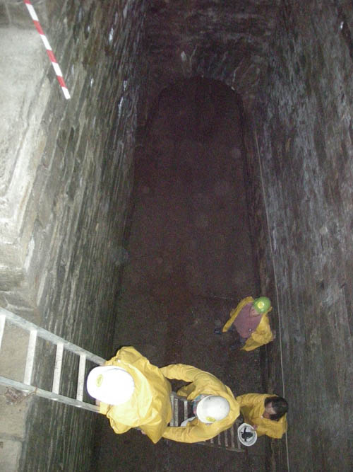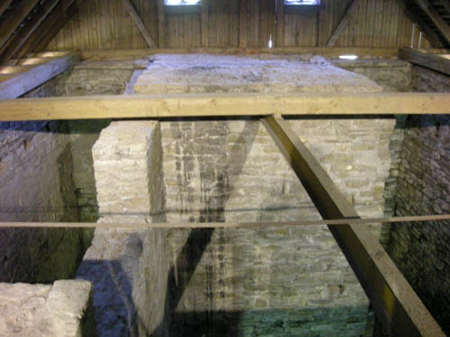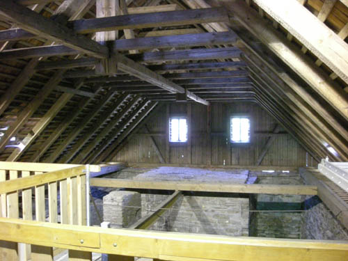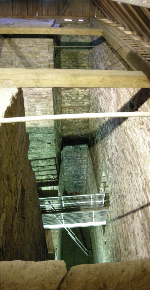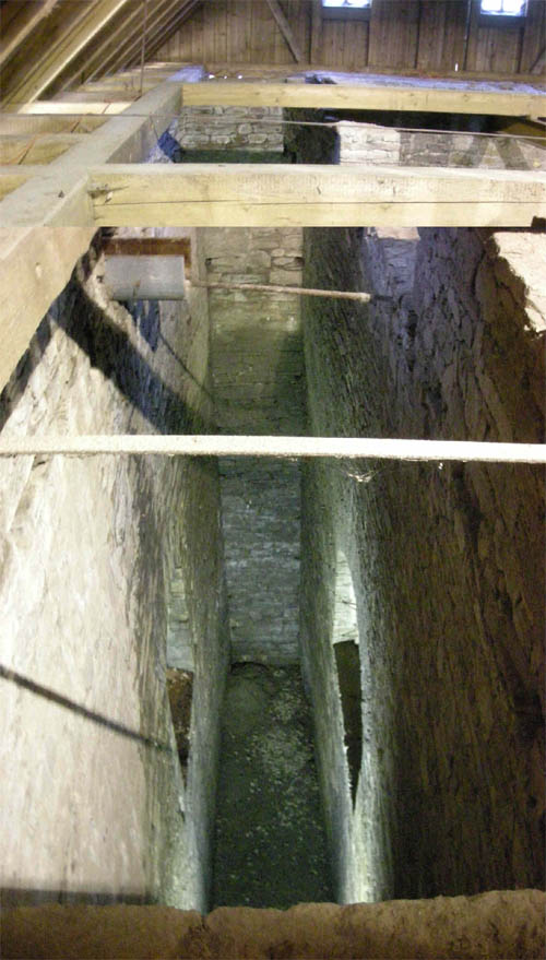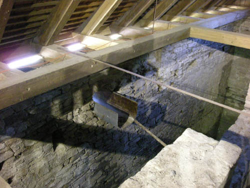 So: Aber wir wollten ja einmal in die freigelegten Radkammern hineinschauen: Hier links und rechts unter dem Dach waren die beiden fast 12 m im Durchmesser messenden Antriebsräder für die Wasserkunst und die Förderung eingebaut. |