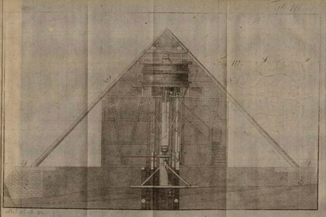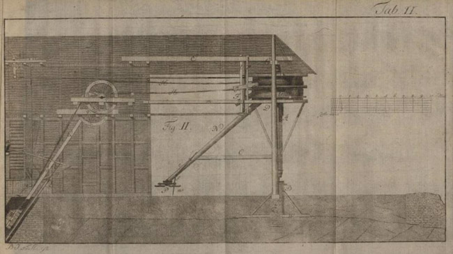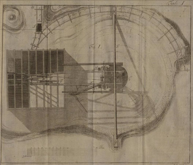 Etwas moderner: Ein Grundriß aus Lebrecht Johann Friedrich Erler: "Ausführliche Beschreibung des Pferdegöpels auf der Grube Neuer Morgenstern Erbstolln am Muldenberge bey Freyberg", Grazische Buchhandlung, Freyberg und Annaberg, 1792. |