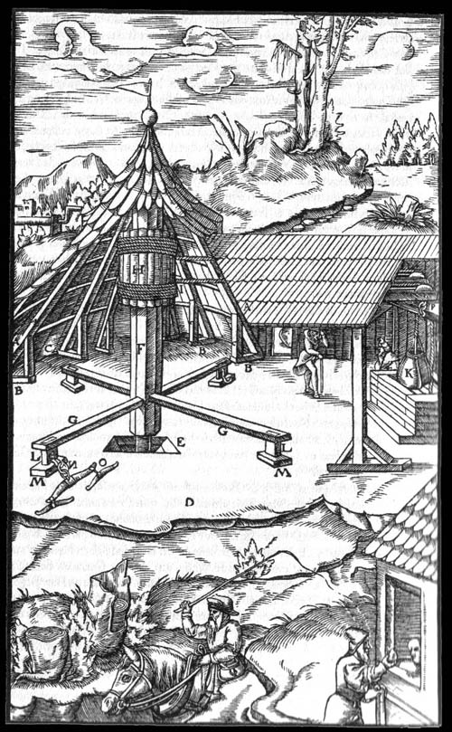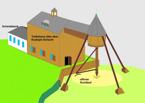 Ganz oben: Der Pferdegöpel Wo immer es zu aufwendig war, ausreichend viel Aufschlagwasser für einen mechanischen Antrieb der Kunstgezeuge oder der Förderanlagen heranzuleiten, nutze man auch tierische Muskelkraft als Energiequelle. So auch hier östlich der Dreibrüderhöhe: Der Rudolph- Schacht liegt am Rand einer Hochfläche und hier stand kaum Antriebswasser zur Verfügung. Deshalb hat man hier 1838-1839 die Göpelanlage für die Förderung nach Übertage errichtet. Mit zwei PS ließ sich die Förderung auch über größere Tiefen eben viel günstiger realisieren, als in einem gebrochenen Schacht mit mehreren Haspeln und etlichen Haspelknechten. Das war auch schon zu Agricola's Zeiten so und natürlich findet sich in "De Re Metallica" eine entsprechende Darstellung einer ähnlichen Anlage.