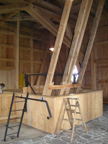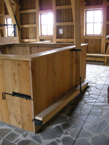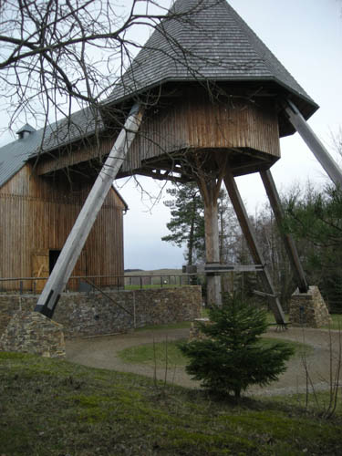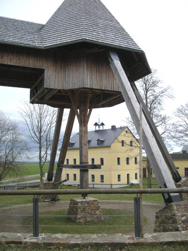 Das Huthaus mit dem typischen Dachreiter für das Bergglöckchen. Vorn die mächtige, stehende Welle des Göpels. |