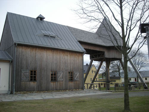 Das Treibehaus von außen: Im Hintergrund das Huthaus und jüngere Bauten aus der Wismut- Zeit. Das Huthaus ist bewohnt, die anderen Gebäude dienen heute als Besucherzentrum. |