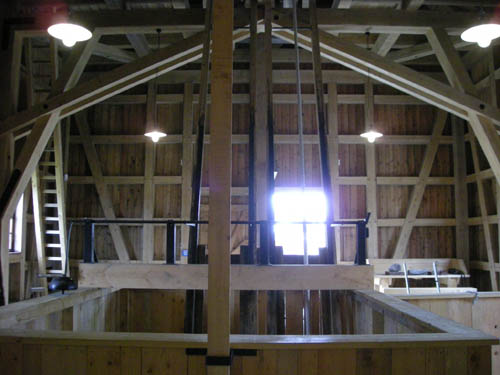Innenraum des Treibehauses: Im Vordergrund die Hängebank mit den beiden Fördertrümern, rechts davon das Fahrtrum. Über der Gebäudefront sitzen die Seilscheiben und lenken die Förderseile in den Schacht. |