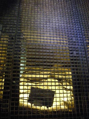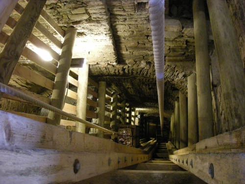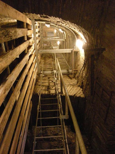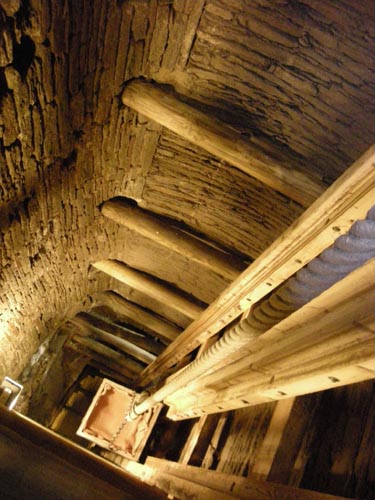 ![]() Blick auf die Ausmauerung im Fahrtentrum. Die vollverzinkten Stahlfahrten und Gitterroste sind natürlich den modernen Sicherheitsanforderungen für den Besucherverkehr geschuldet. Im Gegensatz zu den alten hölzernen Umtrittbühnen lassen sie aber den Durchblick nach oben zu. |