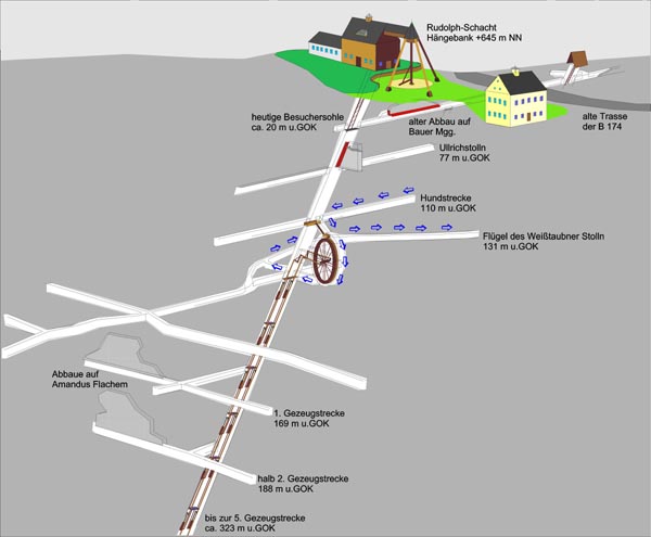 1842 Zum Abschluß unserer Besichtigung verraten wir aber noch, wie sich der Schacht tiefer im Berg fortsetzt und was heute nicht mehr für Besucher zu besichtigen ist. Das Füllort auf der Stollnsohle ist prinzipiell über den Weißtaubner Stollnflügel noch befahrbar. Der Schacht unterhalb dieser Sohle ist aber mit Bruch- und Versatzmassen verstürzt, wobei auch Kunstgestänge und Pumpen verschüttet und zerstört wurden. Aufgrund der geothermischen Nachnutzung des benachbarten Wismutschachtes 302 sind heute grundsätzlich keine Besucherbefahrungen dieses Bereiches mehr möglich und die nachfolgenden Bilder entstanden noch vor den Ausbauarbeiten am Schacht 302. Unter der Hängebank verbergen sich zunächst die tagesnahen Baue der Alten aus dem 16. Jahrhundert auf dem Bauer Morgengang, die kaum rißkundlich erfaßt sind. Sie wurden über den alten Ullrichstolln in etwa 77 m Tiefe entwässert. Der damalige "Wasserlochschacht" wurde aber bereits von den Alten unter der Stollnsohle weiter abgeteuft, so daß auf dem Niveau des Ullrichstollns schon im 18. Jahrhundert eine Radstube für ein Kunstrad bestand. Sie wurde nach dem Anlegen der neuen Radstube abgeworfen, mit Abraummassen aufgefüllt und ist heute nicht mehr fahrbar. Im 19. Jahrhundert erlebte der Bergbau noch einmal eine neue Blütezeit: Der im Bereich des Schachtes kreuzende Amandus Flache brachte reiche Erzanbrüche. Um die Wasserhaltung zu erleichtern und den Schacht weiter abteufen zu können, wurde 1842 über dem in 130 m Tiefe untertage einkommenden Flügel des Weißtaubner Stollns eine neue Radstube ausgehauen. Das gehobene Wasser konnte dadurch zusammen mit dem Antriebswasser auf dem Niveau des Weißtaubner Stollns abfließen, so daß außerdem die oberen Pumpensätze bis zum Niveau des Ullrichstollns nicht mehr benötigt wurden. Mit diesem Kunstrad und zwei Pumpensätzen - bereits mit eisernen Röhren ( !! ) - konnten der Schacht und die angeschlagenen Abbausohlen bis zur 5. Gezeugstrecke in zirka 323 m unter Rasensohle trocken gehalten werden. |