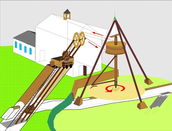 Im Gegensatz zum Pferdegöpel in Johanngeorgenstadt ist in Lauta der Rundlauf unverkleidet geblieben und nur die Seiltrommel wurde mit einem Schutzdach versehen. Die Konstruktion ruht auf nur drei mächtigen Balken, die auf gemauerte Widerlager aufgesetzt wurden. Das Funktionsprinzip war vor 500 Jahren dasselbe wie noch 1838 oder wie noch heute. Unser kleines Raumbild zeigt, wie es im Wesentlichen funktioniert hat: |
