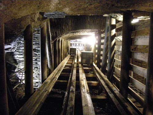 Die Führungsschienen für die Tonnen im Fördertrum. Der Schachtkopf ist mit Natursteinmauerwerk gesichert. |