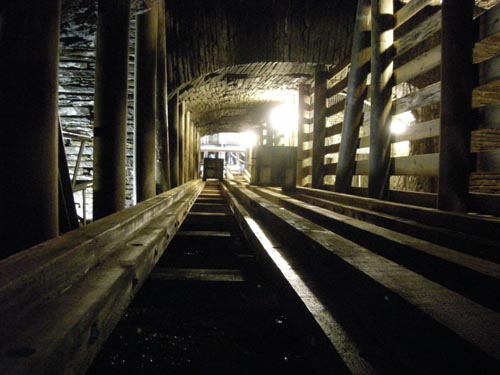 Im weiteren Verlauf ist auch die Abbaustrecke mit Abraum versetzt und nicht mehr fahrbar. In späteren Jahrhunderten konzentrierte sich der Abbau auf die tieferen Sohlen und hier konnte man günstig Abraum unterbringen und so auch die tagesnahen Gangbereiche stabilisieren. |