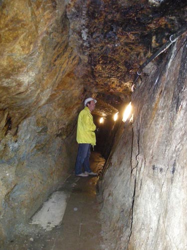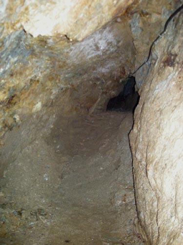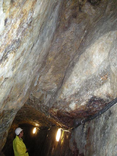 Nach Nordosten wurde der Gang im 16. Jahrhundert abgebaut. Über dem Firstgewölbe liegen abgebaute und mit Abraum versetzte Gangbereiche. |