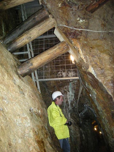![]() Im tonnlägigen Schacht oberhalb der Weißtaubner Stollnsohle: Rechts im Bild das dicke Rohr für die Zuleitung des Antriebswassers der Wassersäulenmaschine. (Foto mit freundlicher Genehmigung von S.Müller zur Verfügung gestellt von F.Ihle) |