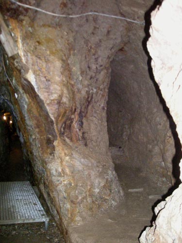 Hinter dem Wetterschacht wurde ein kleines Nebentrum des Morgenganges bergmännisch untersucht, jedoch keine bauwürdige Vererzung vorgefunden und der Vortrieb nach einigen Metern eingestellt. Sehenswert die Schlägelarbeit. Durch die gebirgsschonende Handarbeit blieb dieser schmale Pfeiler bis heute stehen. |