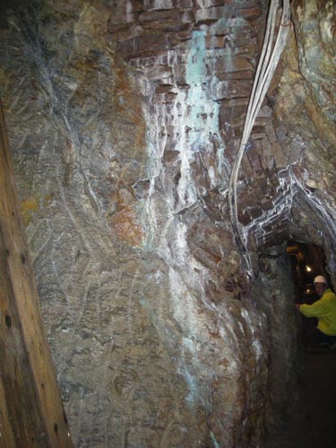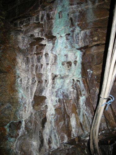 Anhand der hellblauen Färbung der Sinter an diesem Mauerwerk erkennt man, daß die Versatzmassen dahinter noch Reste von Kupfererz enthalten. Die Färbung kommt durch Chalkanthit (ein Kupfersulfat) zustande. |