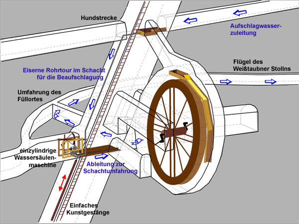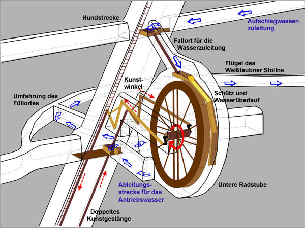 Als Grundlage unserer Rekonstruktion dienten u. a. ein Anlagsriß von R. B. Wappler aus dem Jahr 1845, der im Altbestand der wissenschaftlichen Bibliothek der TU Bergakademie in Freiberg erhalten geblieben ist, sowie Mehrsohlengrundrisse aus der Zeit des Uranbergbaus durch die damalige SDAG Wismut. Um die herauszusprengende Gesteinsmenge möglichst gering zu halten, wurde diese Radstube annähernd rund angelegt. Und so etwa hat das Kunstrad funktioniert: Das Aufschlagwasser entstammte dem Lautenteich und wurde vom Herzog Carl Schacht über die Hundstrecke herangeleitet. Zwischen Hundstrecke und Weißtaubner Stollnsohle besteht ein Höhenunterschied von zirka 21 m. Dies war für ein "genormtes" Wasserrad von 5 bis 6 Lachter Durchmesser zuviel. Das Kunstrad am Rudolphschacht war deshalb mit zirka 13,5 m Durchmesser bereits "übergroß", trotzdem mußte zwischen der Radkammer und der Hundstrecke ein kleines Fallort angelegt und mit einer Rohrleitung überbrückt werden. Diese zirka 6 m Höhendifferenz fehlten natürlich in der Leistungsbilanz des Wasserrades. Die dem Rad zufließende Wassermenge und damit dessen Antriebsleistung wurde am Wasserkasten in der Hundstrecke reguliert. Über dem Rad war ein zweiter Wasserkasten eingebaut, aus dem im Bedarfsfall das Antriebswasser über einen Klappenmechanismus ab- und um das Rad herum geleitet werden konnte. Der Antriebsmechanismus der Pumpengestänge war "standardisiert" und wurde von bewährten Anlagen übernommen: Beidseitig auf der Radwelle saßen Krummzapfen, welche die Streckengestänge gegenläufig bewegten. Am Schacht lenkten zwei Kunstwinkel die horizontale Bewegung um und übertrugen sie auf die Schachtgestänge. Das Antriebswasser und das