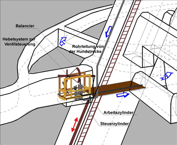 Nächste Stufe: Die Wassersäulenmaschine von 1874 Im Jahr 1874 wurde das Kunstrad durch eine Wassersäulenmaschine ersetzt. Diese hydraulischen Maschinen sind eine Besonderheit des sächsischen Bergbaus und wurden im 18. Jahrhundert entwickelt. Sie sind jedoch nur selten am Originalstandort erhalten geblieben, geschweige denn dort zu besichtigen. Deshalb hat sich diese Anlage einige weitere Sätze verdient: Das Rahmenwerk und die meisten Hebel der Maschine waren noch aus Holz gefertigt, lediglich die wasserdruckbelasteten Teile - Rohre, Arbeits- und Steuerzylinder - sowie die Beschläge der beweglichen Teile waren bereits aus Gußeisen oder Stahl. Viele der gußeisernen Teile der Wassersäulenmaschine sind deshalb im Gegensatz zum hölzernen Wasserrad bis heute erhalten geblieben. Konstruktionsunterlagen zur Maschine am Rudolphschacht konnten bislang nicht aufgefunden werden, so daß nur anhand der erhaltengebliebenen Reste zu schlußfolgern ist, daß diese Maschine etwa baugleich zu der am Drei Weiber Schacht eingebauten Anlage gewesen sein muß: Demnach war es eine einzylindrige Maschine, welche nicht über eine starre Traverse, sondern über ein - einem Balancier ähnliches - Kunstkreuz die Schachtgestänge antrieb. Sie verfügte nicht über die Brendel`sche Ventilsteuerung, sondern wurde durch ein Hebelsystem gesteuert. Die Kolbenstange des Steuerzylinders wurde dazu mit einer Zahnstange versehen. Mittels des Hebelsystems wurde jeweils am oberen und unteren Totpunkt durch einen halben Zahnkranz die Kolbenstange auf- bzw. abwärts bewegt und dadurch die Ventile abwechselnd geöffnet und geschlossen. Nach den erhalten gebliebenen Berichten hat man die bereits für das Wasserrad eingebauten Pumpensätze weiter verwendet, jedoch muß man - bedingt durch die einseitige Aufstellung der Wassersäulenmaschine am Schacht - das doppelte Schachtgestänge durch ein einfaches Gestänge ersetzt haben. Eindrucksvoll ist besonders der Größenunterschied zum Wasserrad in unserer folgenden Skizze. Mit der vollen Fallhöhe von 21 m erreichte der Wasserdruck im Arbeitszylinder rund zwei Bar und die gesamte potentielle Energie konnte in mechanische Arbeit umgesetzt werden. Zudem waren die Reibungsverluste - da auf Kurbelgetriebe, Kunstwinkel und Streckengestänge verzichtet werden konnte - deutlich geringer als beim Wasserrad. (Weitere Erläuterungen zur Wirkungsweise der Wassersäulenmaschinen findet man in unserem allgemeinen Beitrag zu den im Bergbau eingesetzten Wasserkraftmaschinen.) |