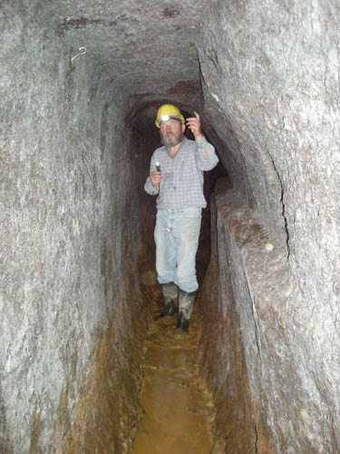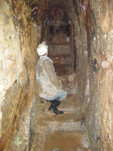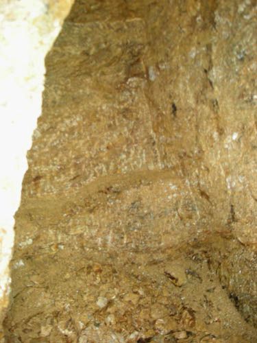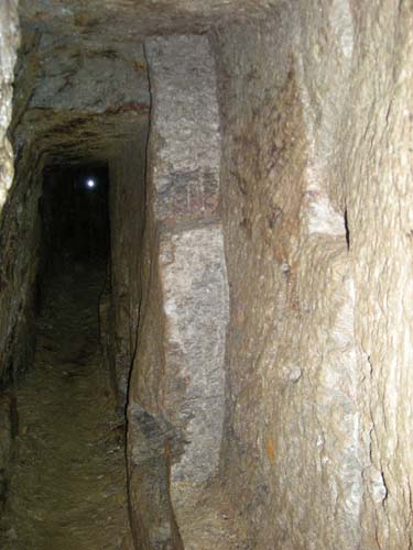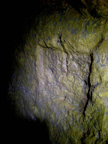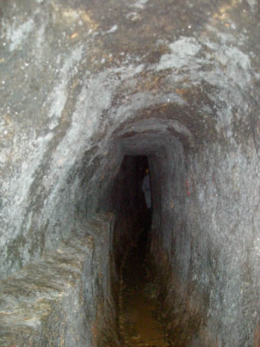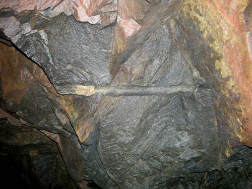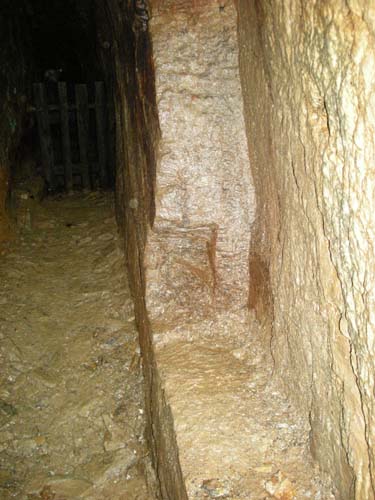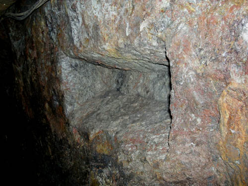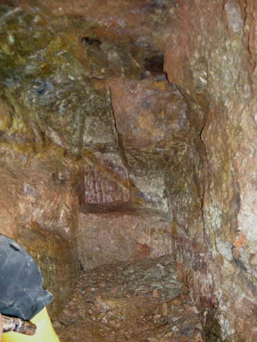 Gleicher Ort, die Endschaft des geschlägelten Querschlags: Auch hier sieht man gut die stufenförmigen Einschläge des Hauers. Die Methode entwickelte sich wohl aus der täglichen Erfahrung heraus, wie man das Gestein am besten löste... |