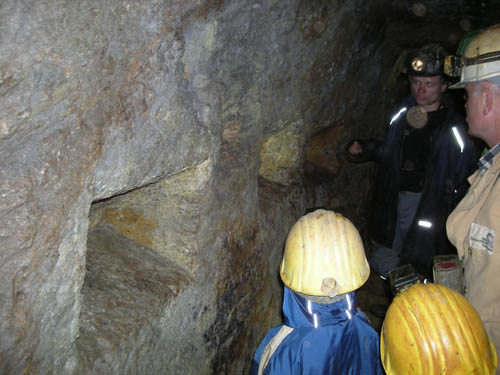 ![]() An der Ortsbrust dieser Strecke am Himmelsfürster Schacht in Pöhla erkennt man gut die hintereinanderliegenden "Stufen", an denen zwei Hauer arbeiteten. |