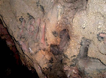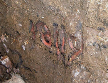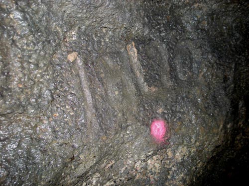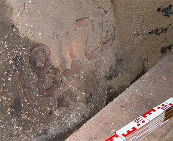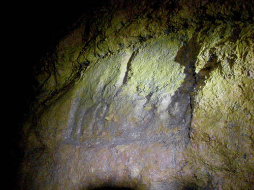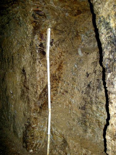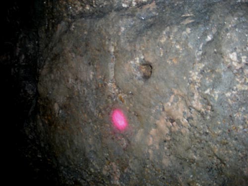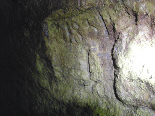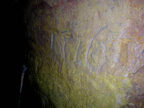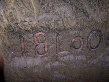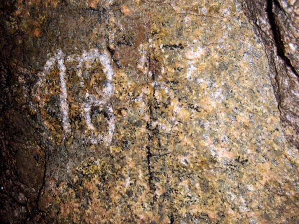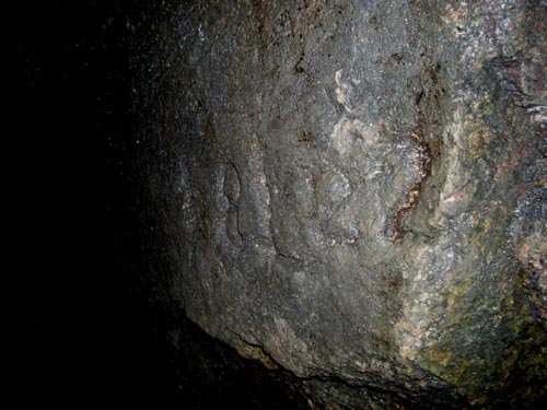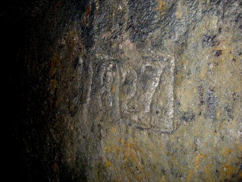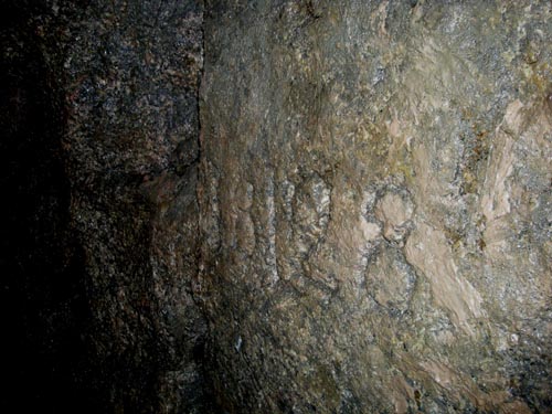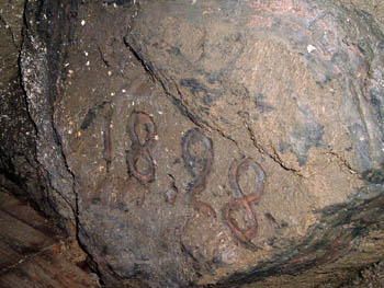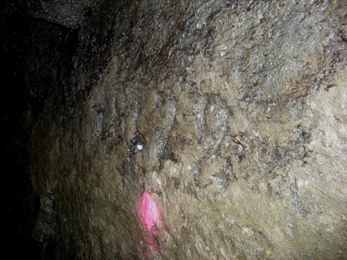 Dies ist die letzte Tafel auf dem rechten Stoß in Richtung Mundloch. Eine Jahreszahl ist nicht zu erkennen - nur vier Punkte und über der Tafel wieder der Rest eines Holzpflocks, an dem der Markscheider wohl seine Schnur befestigt hat. An dieser Stelle haben sich die Kumpel wahrscheinlich mit denen getroffen, die ihnen vom Roten Schacht aus entgegenkamen - denn von hier ab laufen die Jahreszahlen wieder rückwärts und finden sich im gegenüberliegenden Stoß. |