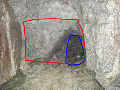 Zur besseren Übersicht nochmal: blau umrandet das Ursprungsprofil, rot umrandet der Nachriss aus der Wismutzeit. Hier war leider nichts mehr zu retten. |